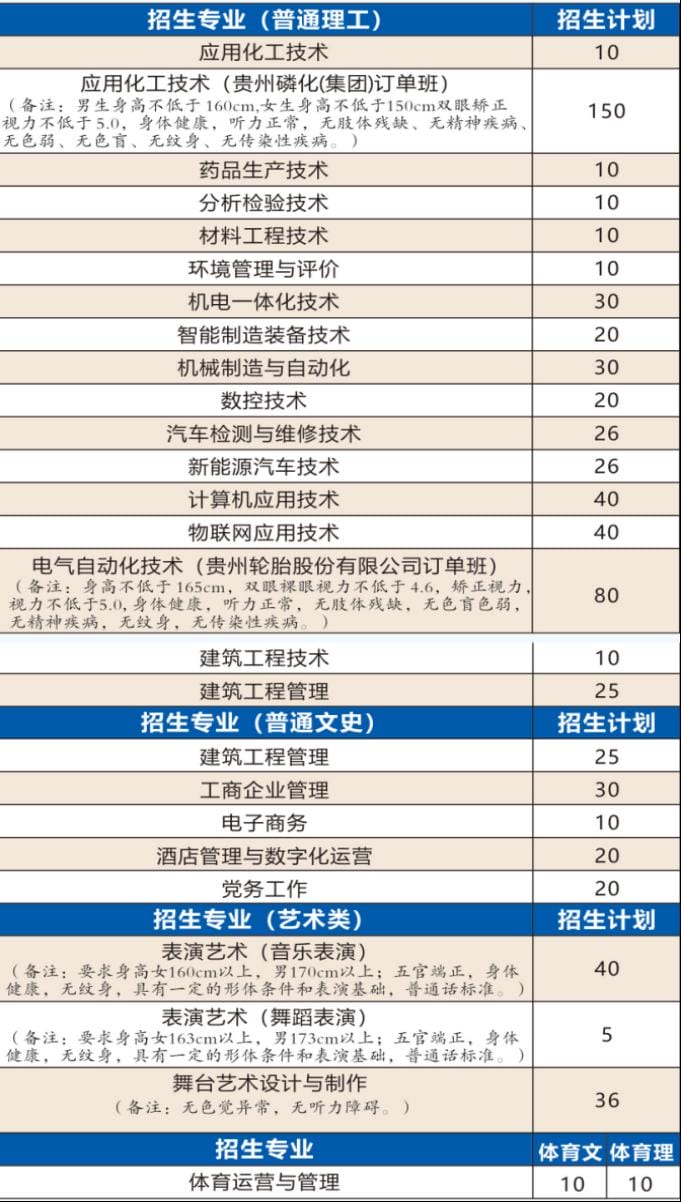 5.应用化工技术(贵州磷化(集团)订单班)招生专业要求,男生身高不低于160cm,女生身高不低于150cm,双眼矫正视力不低于5.0,身体健康,听力正常,无肢体残缺、无精神疾病、无色弱、无色盲、无纹身、无传染性疾病。
